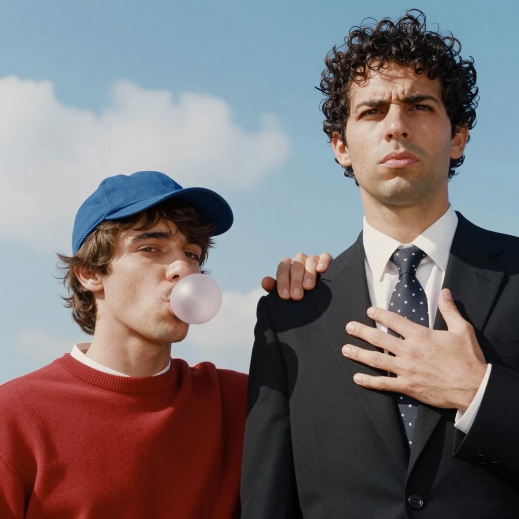 Photograph of two men on separate couches. Left man, wearing glasses, yellow sleeveless shirt, rainbow-striped pants, drinking from red cup, holding black bag with white details. Right man, black suit, red tie, black hat with red band, talking on phone. Red couch on left, blue couch on right. Both relaxed, sitting with legs crossed.