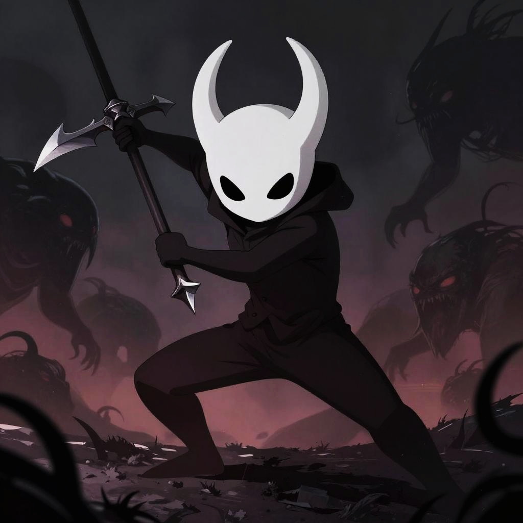 Main character of Hollow Knight mid-battle against shadowy creatures, dynamic pose with nail weapon, intense expression, dramatic lighting highlighting detailed textures, dark fantasy illustration