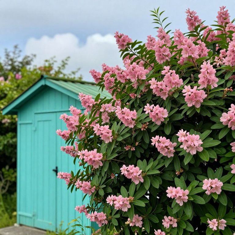 Photograph of a vibrant outdoor scene featuring a turquoise, wooden shed with a slanted roof in the background. The foreground is dominated by a lush bush of pink flowers with dense, dark green leaves. The flowers are small and clustered, creating a striking contrast against the sky, which is partly cloudy. The shed is partially obscured by the bush, adding depth to the image. The overall composition is bright and colorful, capturing the freshness of a garden setting.