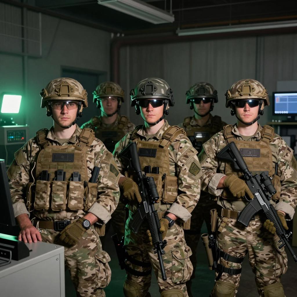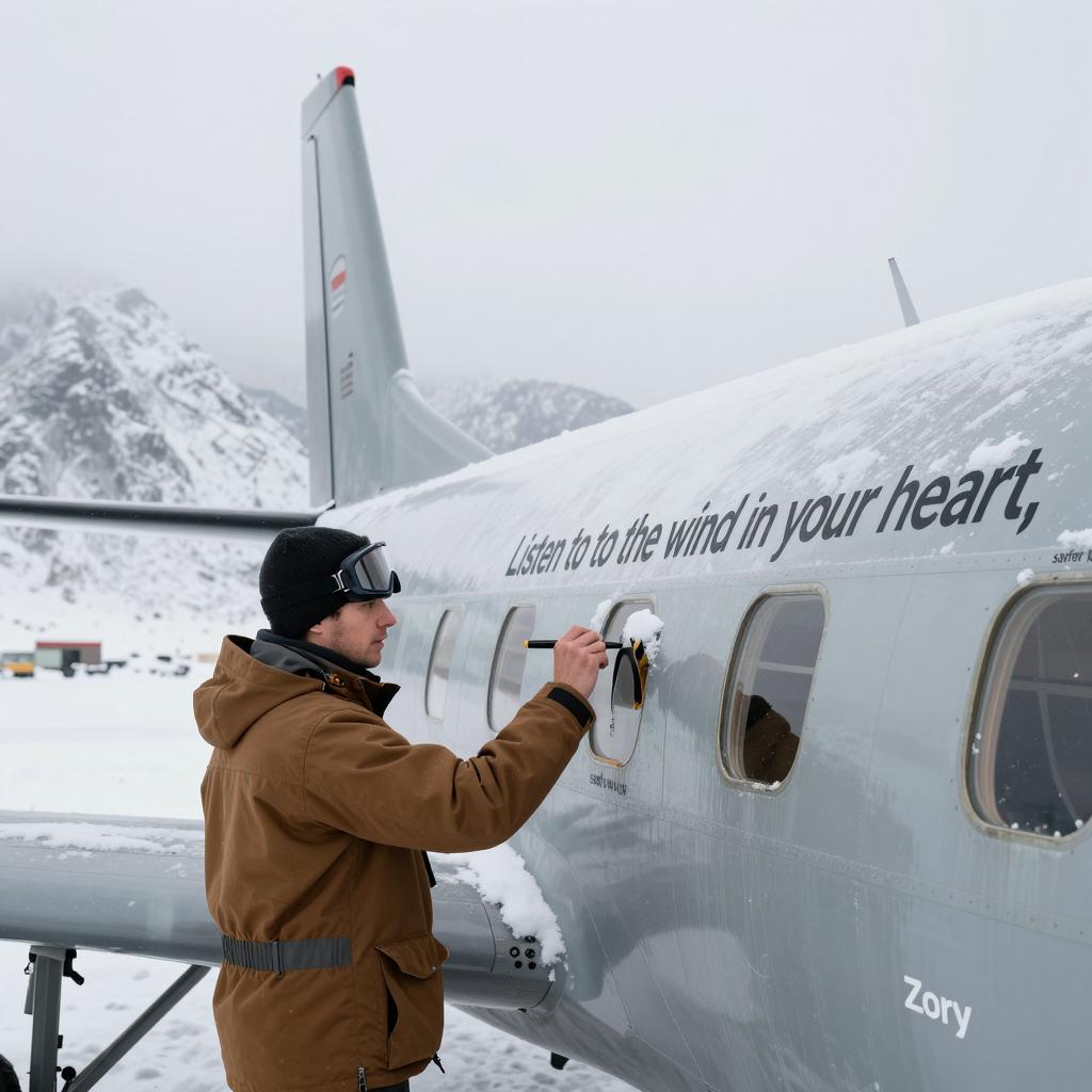 Group of Men by Futuristic Aircraft Wreckage in Snowy Mountains