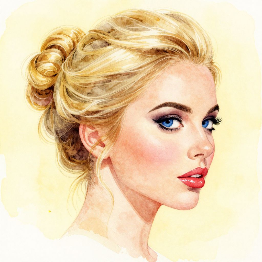Vibrant watercolor portrait captures a woman's profile with meticulously styled blonde hair in a voluminous updo, featuring bold blue eyes, defined eyebrows, rosy cheeks, and glossy red lips, set against a soft yellow background.