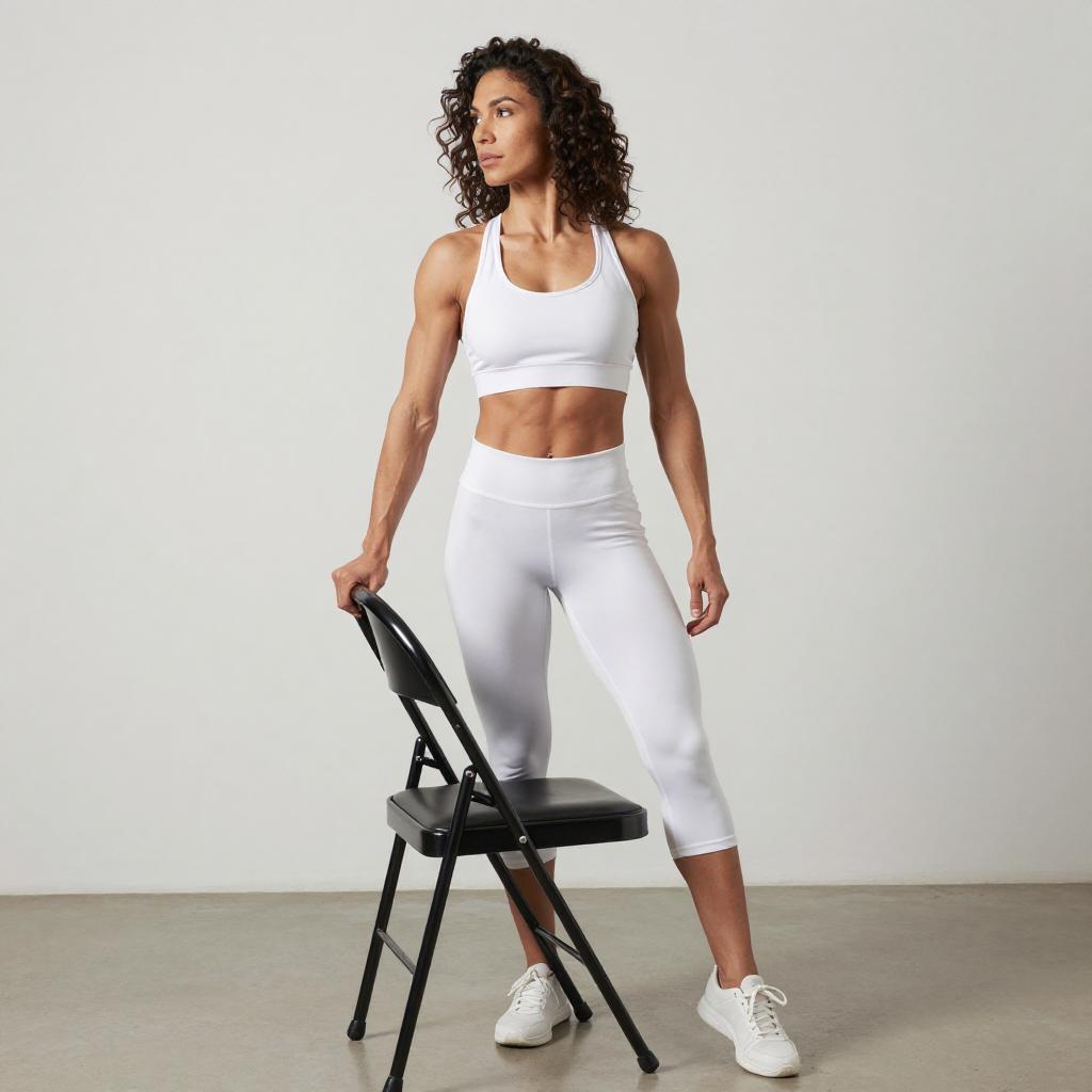 Photograph of a muscular woman with curly dark hair, wearing a white sports bra and tight white capri leggings, standing with her hands on a black folding chair. She has a toned, defined abdomen and is looking to the side. The background is a plain white wall and gray floor.