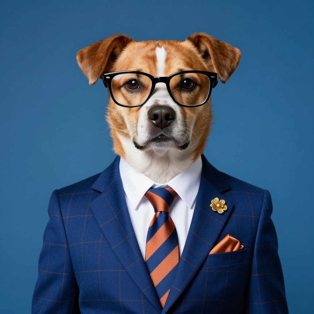 Photograph of a brown and white dog with glasses, dressed in a dark blue plaid suit jacket, white shirt, and orange and navy striped tie. A golden flower-shaped pin is on the left lapel, and an orange pocket square peeks from the jacket pocket. The dog's expression is serious, and it stands against a solid blue background. The image combines elements of humor and sophistication, highlighting the dog's human-like attire and accessories. The dog's fur texture contrasts with the smooth fabric of the suit.
