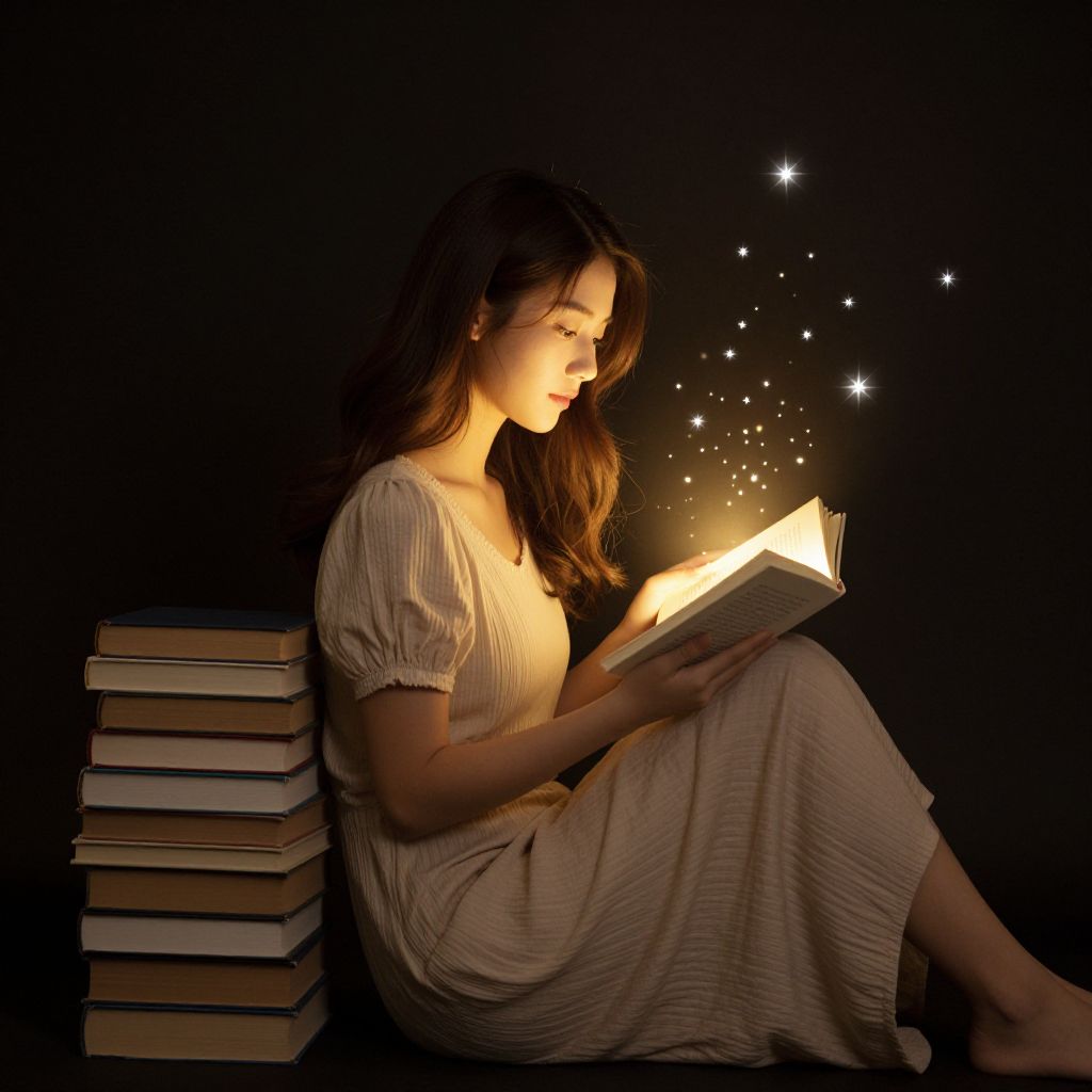 A young woman sits gracefully against a stack of twelve books, her hands gently cradling an open book illuminated by a soft golden light that dances among the twinkling stars above her, creating a celestial ambiance as she reads.
