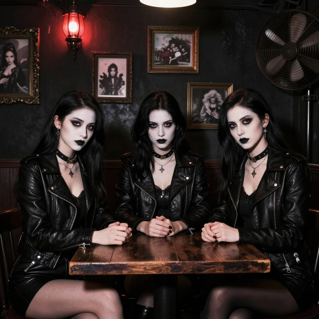 Photograph of three gothic-style people in a dimly lit room with red velvet curtains. Two women with pale skin, black hair, and heavy makeup sit on a black leather couch, wearing black leather jackets and dark clothing. A man with tanned skin and tattoos stands behind them, also in dark attire. Candles on a candelabrum glow in the background, adding a moody atmosphere.