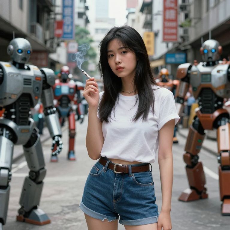 Photograph of an Asian woman with long black hair, wearing a white t-shirt and blue denim shorts with a brown belt, standing in a city street. She holds a lit cigarette in her right hand, with a slight, neutral expression. Surrounding her are several humanoid robots of varying colors and designs, walking in the background. The street is lined with buildings, and there are signs in the distance. The image has a slightly surreal, sci-fi feel, blending urban and futuristic elements. The woman's casual attire contrasts with the robotic figures.