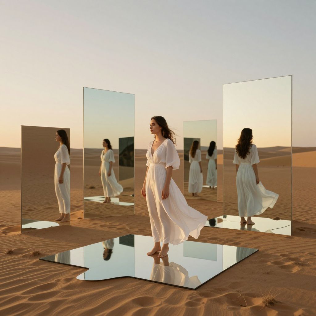 In a surreal desert landscape bathed in golden hour light, a woman in a flowing white dress stands amidst an array of reflective mirrors, each capturing fragmented reflections that blend reality with ethereal collages of imagined lives, evoking a dreamlike, cyberpunk-inspired visual narrative.