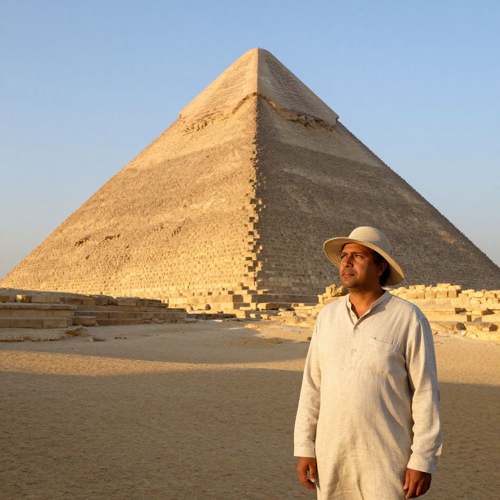 A serene morning shot of a majestic historic pyramid standing in the desert under a golden sunrise, with soft sand dunes in the background and a clear blue sky, showing the ancient stone structure with cracked mortar and weathered hieroglyphs on the walls; a middle-aged man in a traditional linen shirt and wide-brimmed hat stands nearby, looking in admiration with focused eyes and a neutral expression, capturing the quiet grandeur of history.