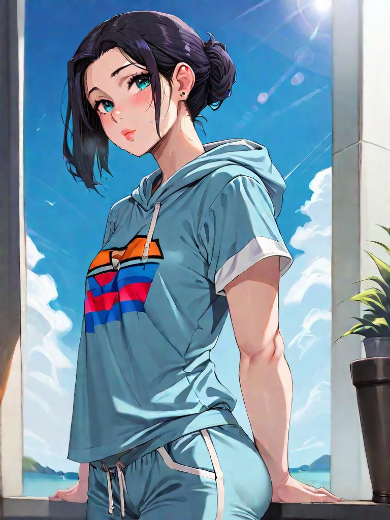 1girl, realistic face, Rash guard outfit, short-sleeve top, moisture-wicking spandex, deep navy blue, geometric print, joggers included, soft cotton blend, drawstring closure, relaxed fit, side pockets, contrasting orange stitching.