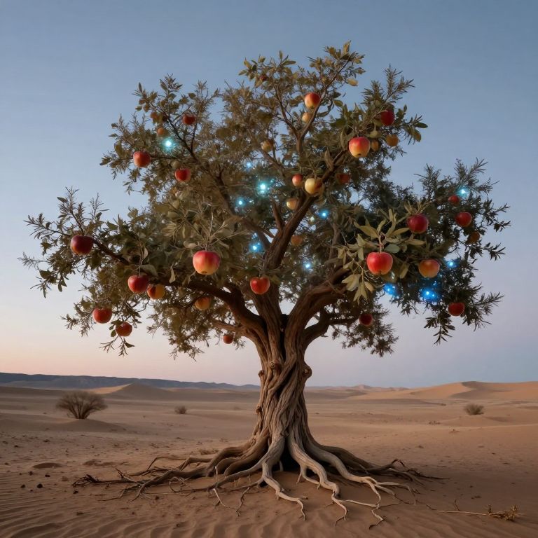 A radiant, otherworldly tree stands rooted in a barren desert, its branches adorned with glowing apples that emit celestial light, defying the starkness of the surrounding landscape.