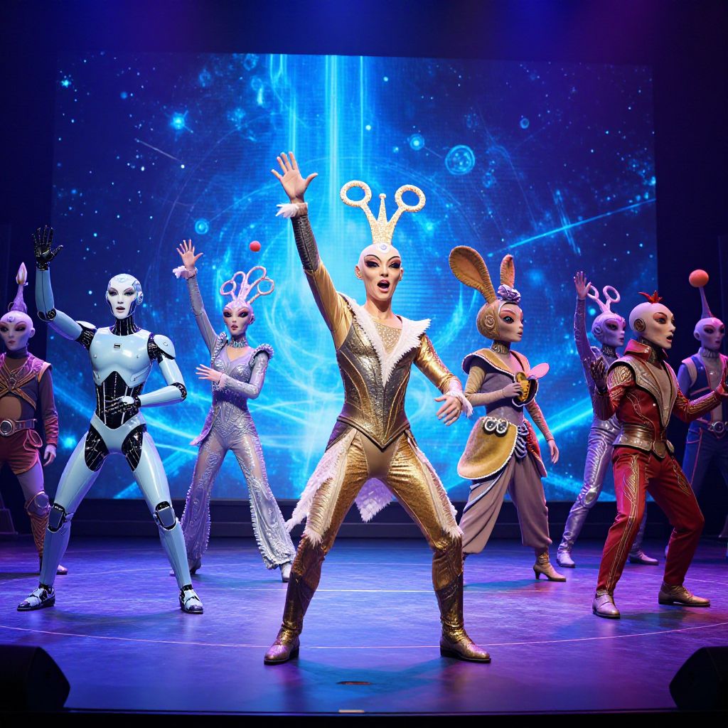 A lively scene from AI alien the musical featuring sleek android performers and whimsical alien creatures in elaborate costumes, performing on a holographic stage with interstellar backgrounds and dynamic lighting, capturing the energy and creativity of a sci-fi musical extravaganza