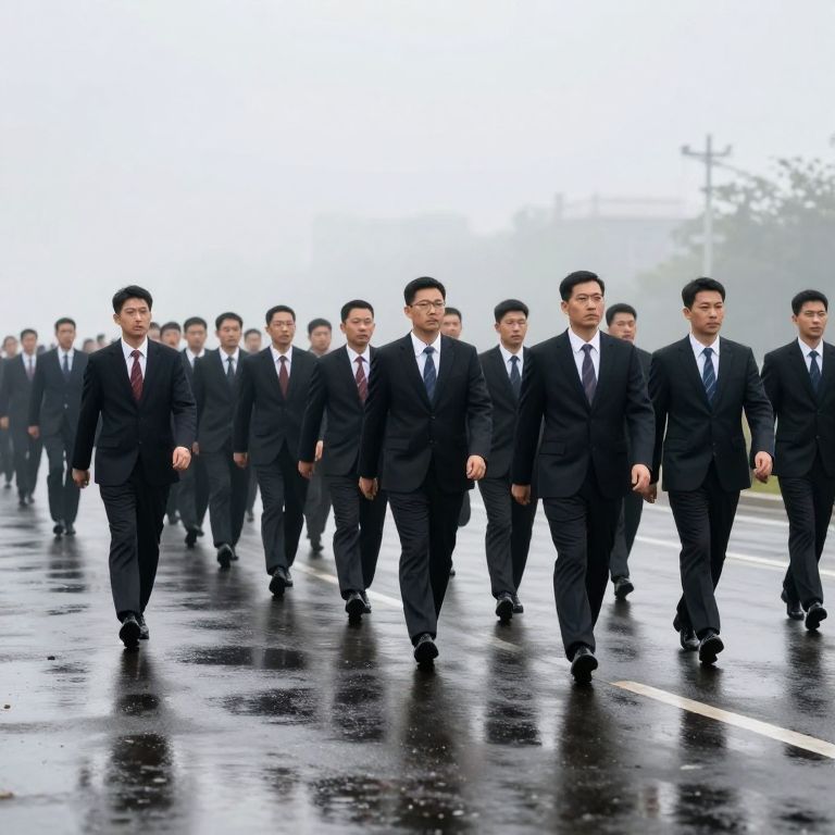 Rows of formally dressed individuals march forward in unison along a reflective wet road, their mirrored reflections trailing behind them as they disappear into the misty horizon.