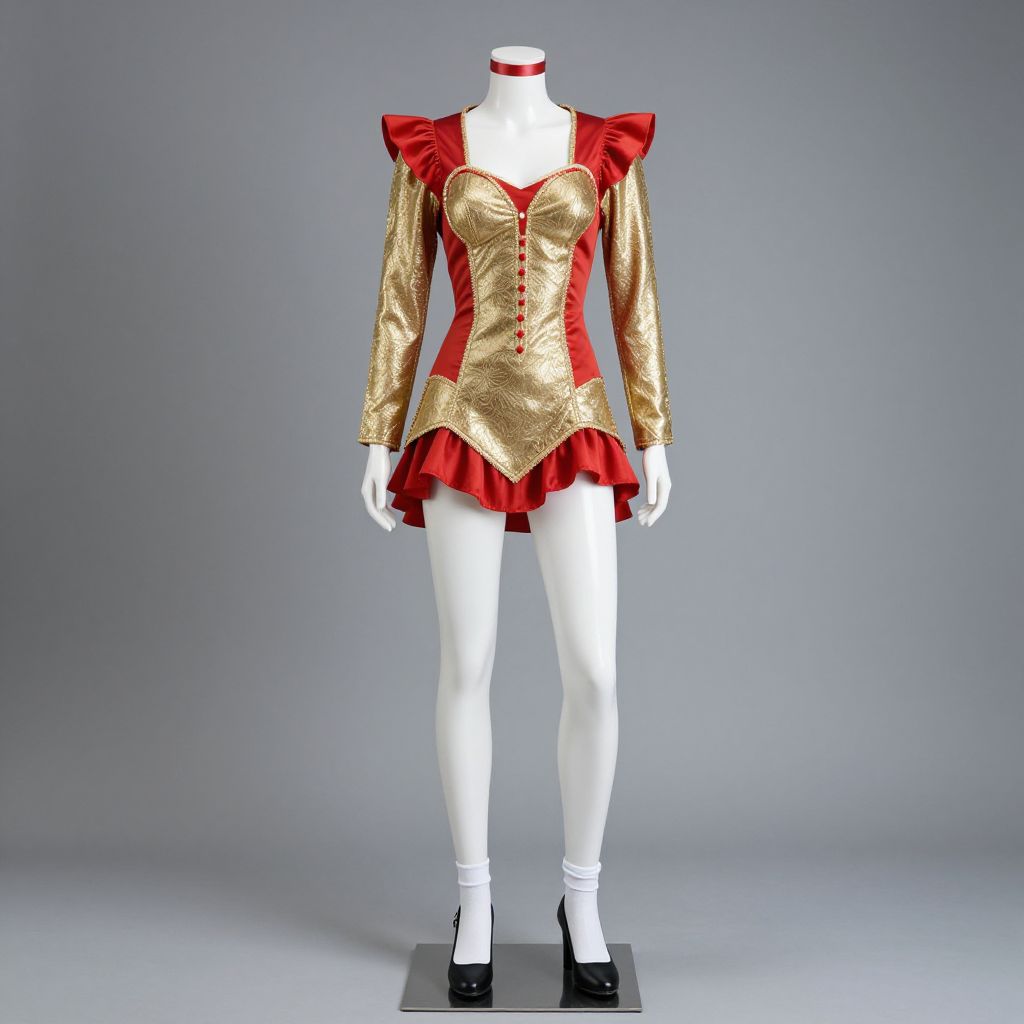 Mannequin wearing a gold and red costume with white socks and black shoes.
