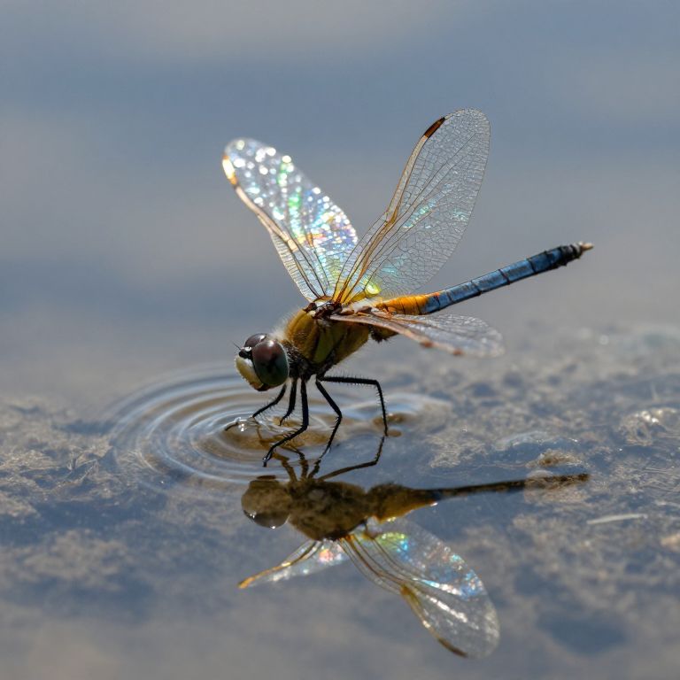 A dragonfly with iridescent, stained-glass wings stands poised on rippling water, its reflection shimmering like a mirror to worlds unseen.