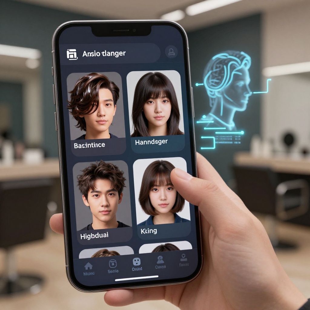 AI hairstyle changer app interface, realistic 3D models demonstrating various haircuts and colors, dynamic lighting highlighting shiny textured hair, user interacting with touchscreen in stylish room, advanced artificial intelligence algorithms visualized with glowing lines and data streams, contemporary aesthetics