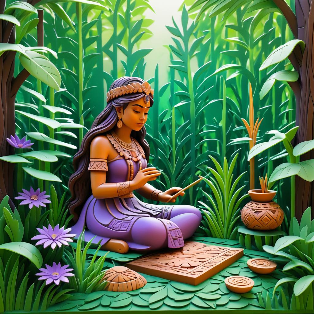 Detailed Aztec-style carving of a gentle female healer from the Middle Ages, depicted sitting cross-legged while tending to herbs in a tranquil forest glade. The carving features lush green leaves, intricate ornamental patterns, and stylized natural elements, inspired by Violet Evergarden and Krenz Cushart artistic styles.