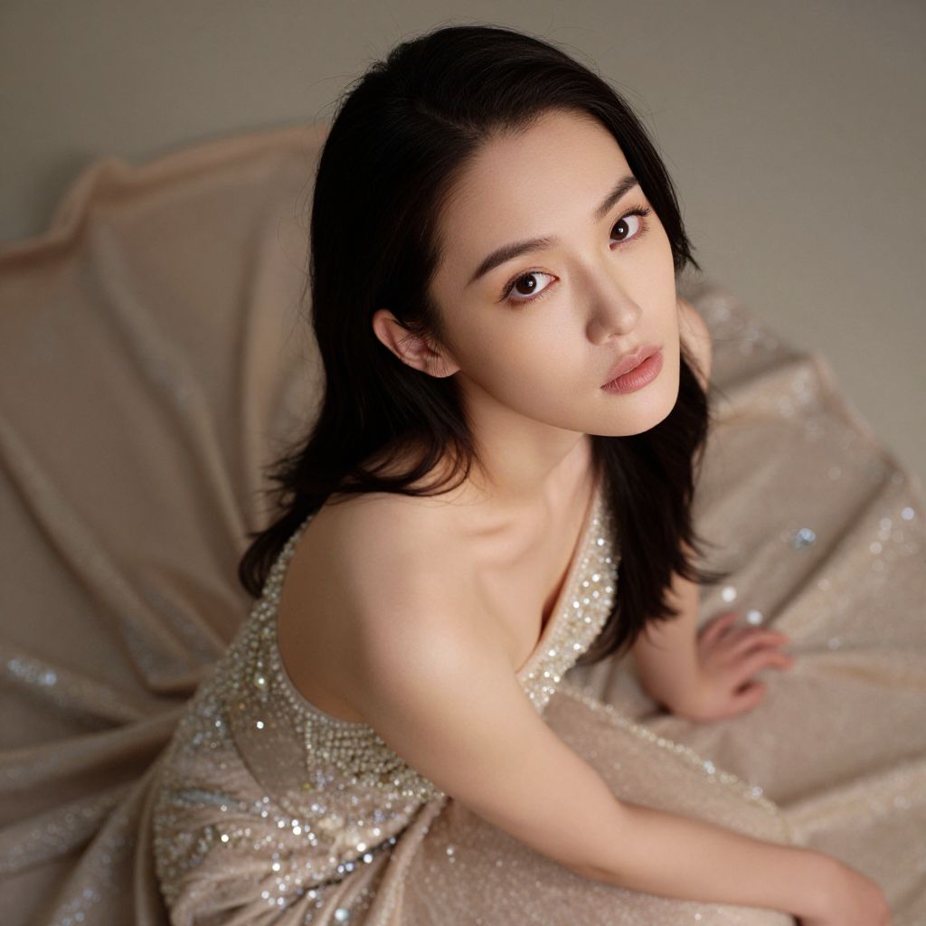 Photograph of an East Asian woman with fair skin, long black hair, and delicate facial features, gazing upward with a slight smile. She is dressed in a sparkling, silver sequin dress that drapes elegantly around her. Her bare shoulders and slender arms are visible. The background is a soft, beige fabric with subtle shimmer, creating a luxurious and sophisticated atmosphere. The lighting highlights her smooth skin and the texture of her dress, adding depth to the image. The overall style is glamorous and high-fashion, emphasizing elegance and beauty.
