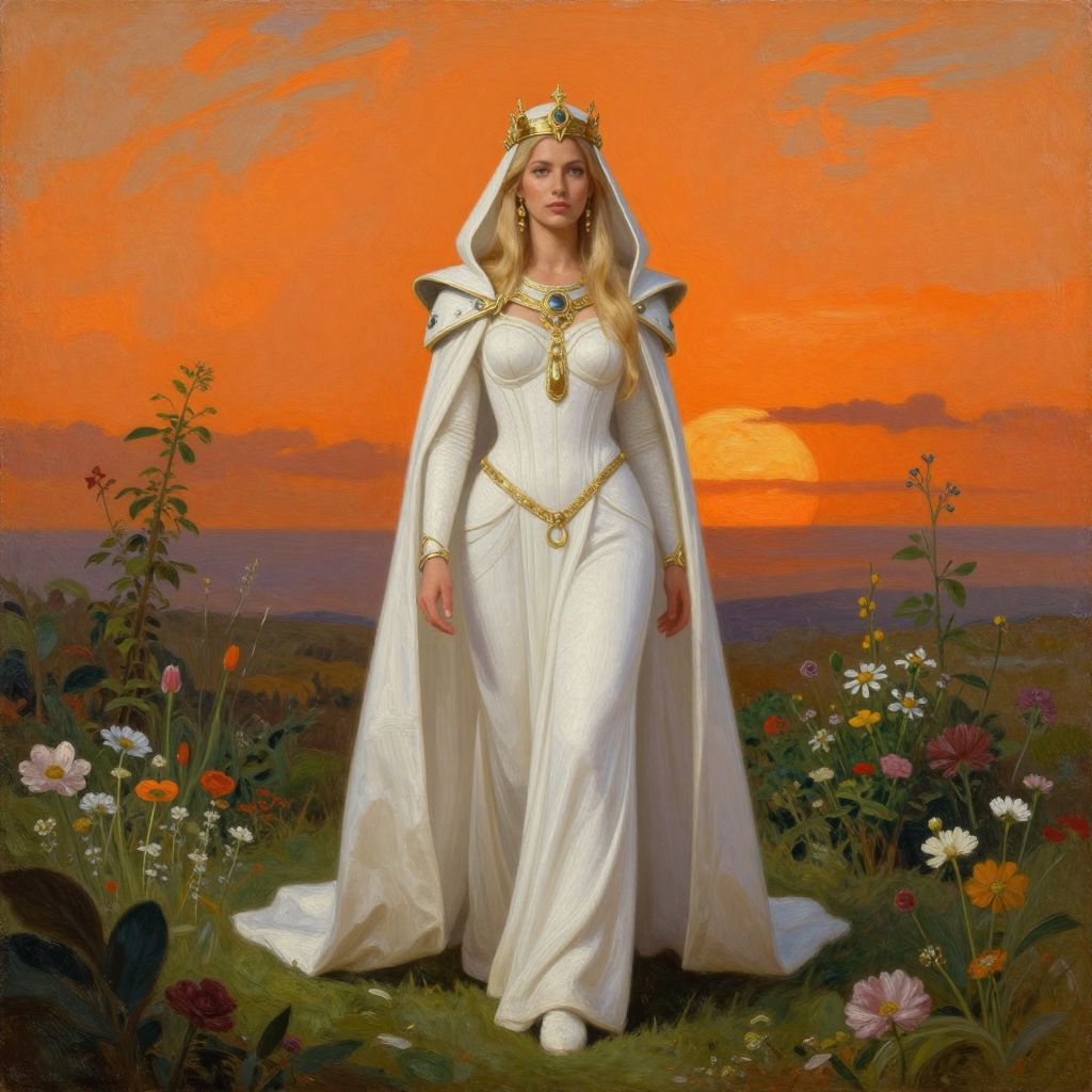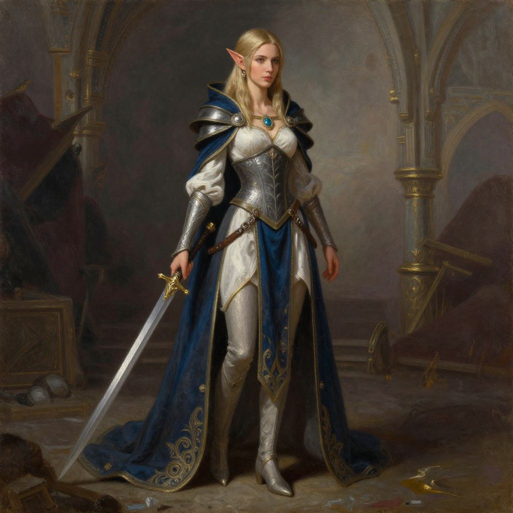 Digital painting of a blonde woman with fair skin, wearing a dark, gold-trimmed robe, holding a glowing red staff, standing in a futuristic