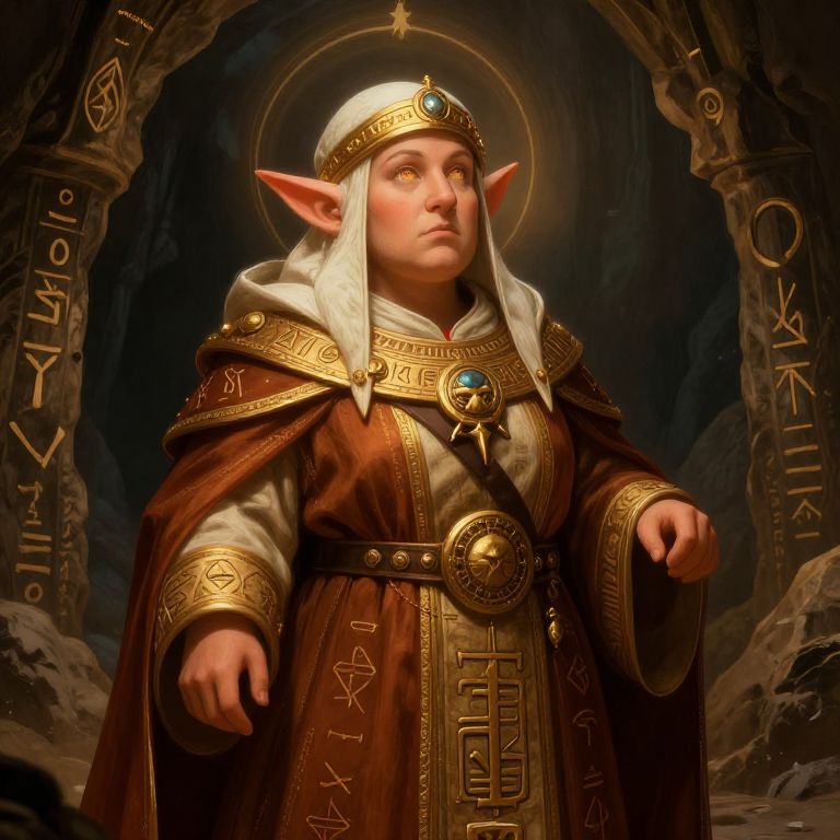 Digital painting of a blonde woman with fair skin, wearing a dark, medieval-style robe with gold trim and a brown leather strap across her chest. She holds a red, glowing staff in her right hand. Her hair is loosely tied back, and she wears gold hoop earrings. The background features a dark, futuristic metallic door with intricate patterns. Her expression is serious, and she has a small blue gem on her belt. The image has a fantasy sci-fi aesthetic, with rich, dark colors and detailed textures.