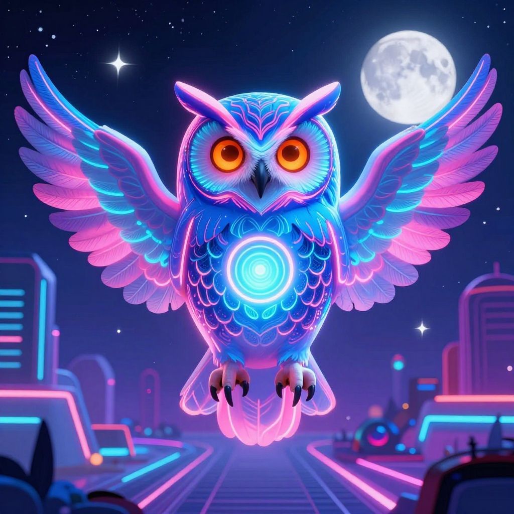 Neon-lit, glowing blue and pink owl with large orange eyes, wings spread, hovering above futuristic cityscape with moon, neon buildings, and