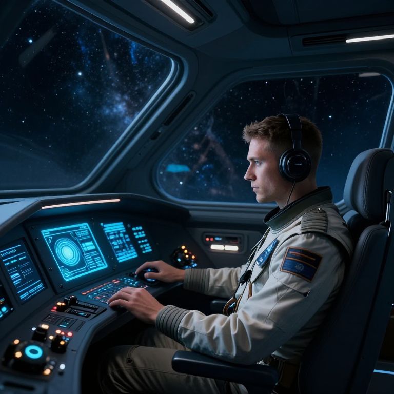 Isaak, a futuristic pilot inside a sleek spaceship cockpit, vast starfield visible through the windows, detailed control panels with glowing holograms, dynamic lighting highlighting focus and determination, sci-fi realism style