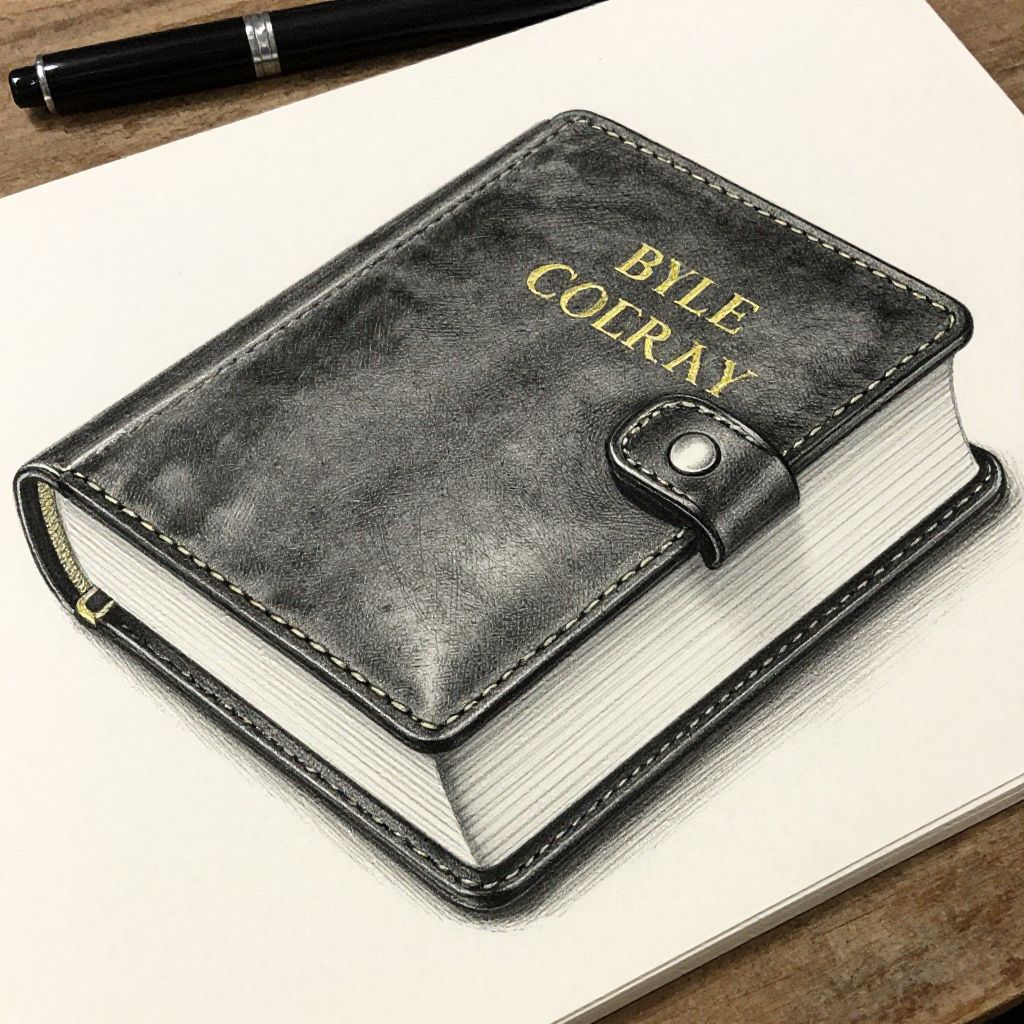Realistic object drawing of an elegant leather-bound book partially open on a rustic desk, visible paper texture and gold embossed title, high contrast shading highlighting depth and folds, hyper-real pencil artwork