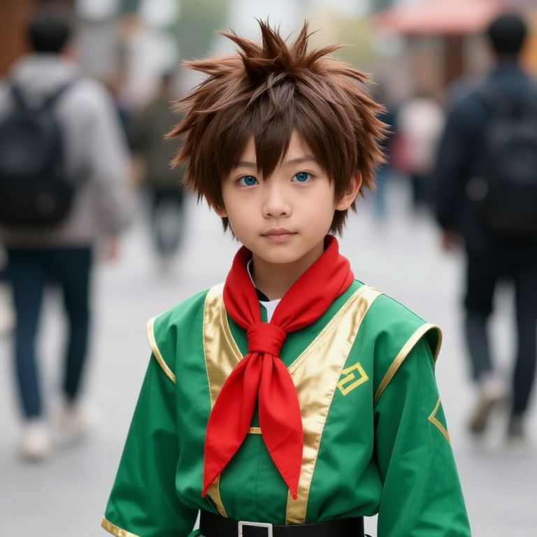 Photograph of an Asian boy with spiky brown hair, wearing a green and gold costume with a red neckerchief, reminiscent of an anime character. His large blue eyes and neutral expression are prominent. The background is blurred, showing a busy urban street with indistinct people in dark clothing. The boy's costume has gold trim and a yellow "P" patch on the left chest. The image has a soft focus on the subject, highlighting his costume and face. The lighting is natural, suggesting daytime.