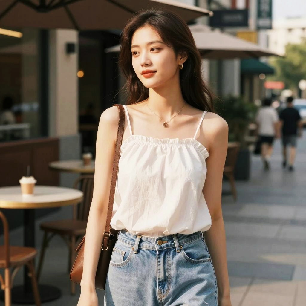 Casual summer outfit featuring a decollet neckline top, soft cotton texture, urban outdoor cafe background, late afternoon sunlight, relaxed and joyful expression, natural makeup, modern city style, vibrant but soft color palette.