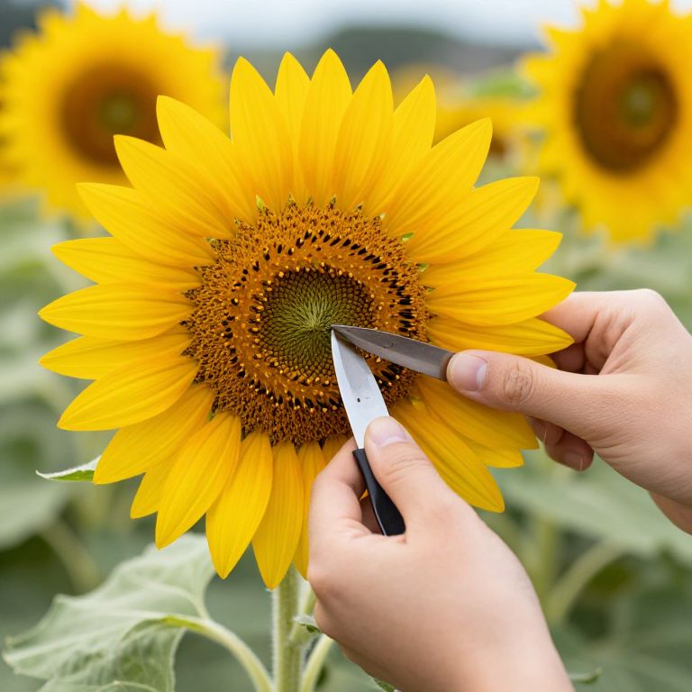 Photograph of a close-up of a person's hands cutting a vibrant yellow sunflower with a small, sharp knife. The sunflower's large, circular face has bright yellow petals radiating from a dense, brown and green central disk. The person's hands, with light skin, are positioned on the right, gripping the knife with two fingers. The background is softly blurred, showing more sunflowers in a green field. The sunlight enhances the vivid colors, creating a bright and cheerful scene. The sunflower's texture is smooth and the petals are slightly curved.
