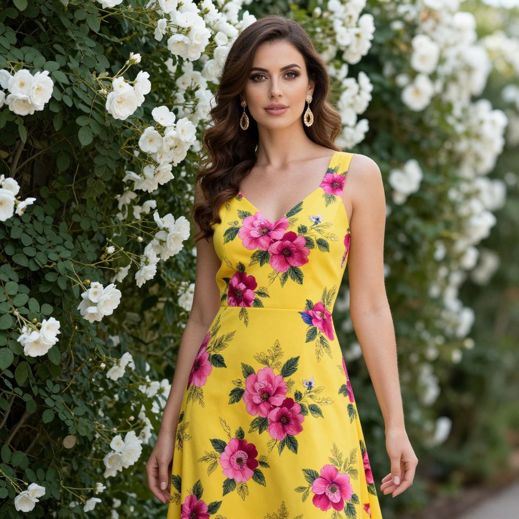 Photograph of a woman with long, wavy brown hair standing in front of a lush, green hedge adorned with white flowers. She is wearing a vibrant yellow sundress with a deep V-neckline and a floral pattern featuring large pink and red flowers with green leaves. She has a slender build and is accessorized with large, dangling gold earrings. Her skin tone is light olive, and she has a confident, slightly smiling expression. The background is softly blurred, focusing attention on her and the bright colors of her dress. The overall style is elegant and summery.