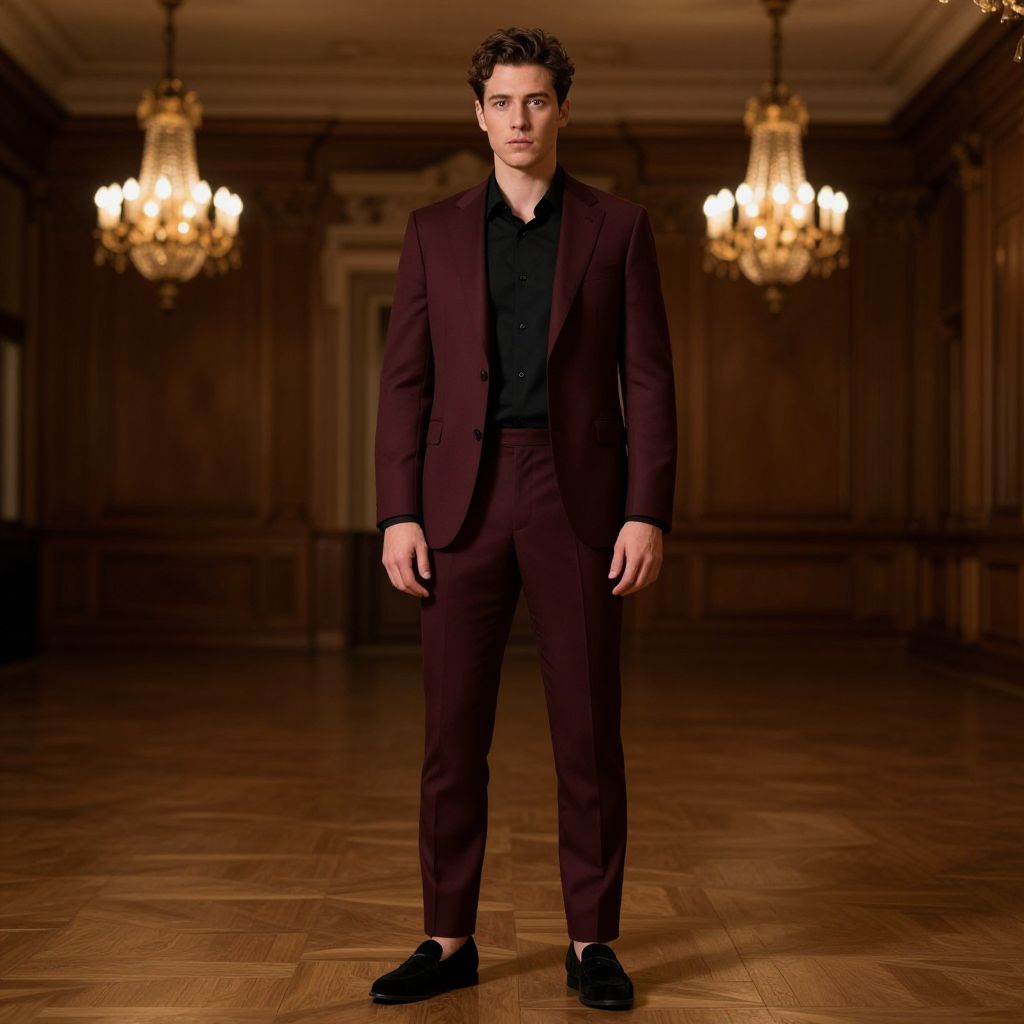 A man, burgundy wool suit, slim cut, black cotton shirt, black suede loafers, elegant sheen, historic hotel ballroom, ornate chandeliers, elegant wooden paneling, soft focus, contemplative expression. Man has masculine face and piercing eyes