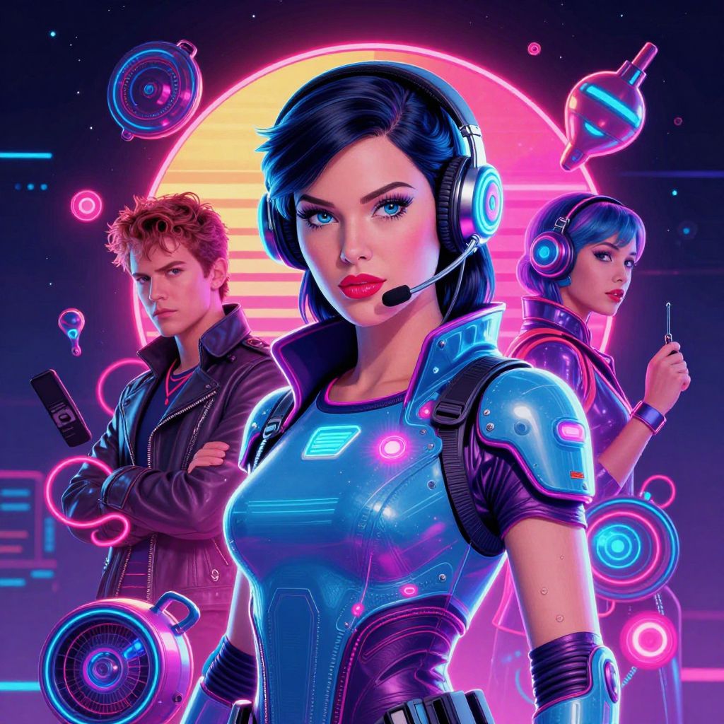 A vibrant, neon-lit retro sci-fi poster featuring a futuristic woman with a headset, surrounded by other characters and futuristic elements, reminiscent of the style of Jamie Hewlett and Jack Kirby.