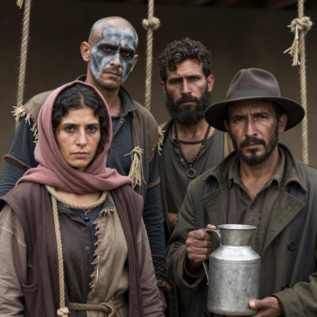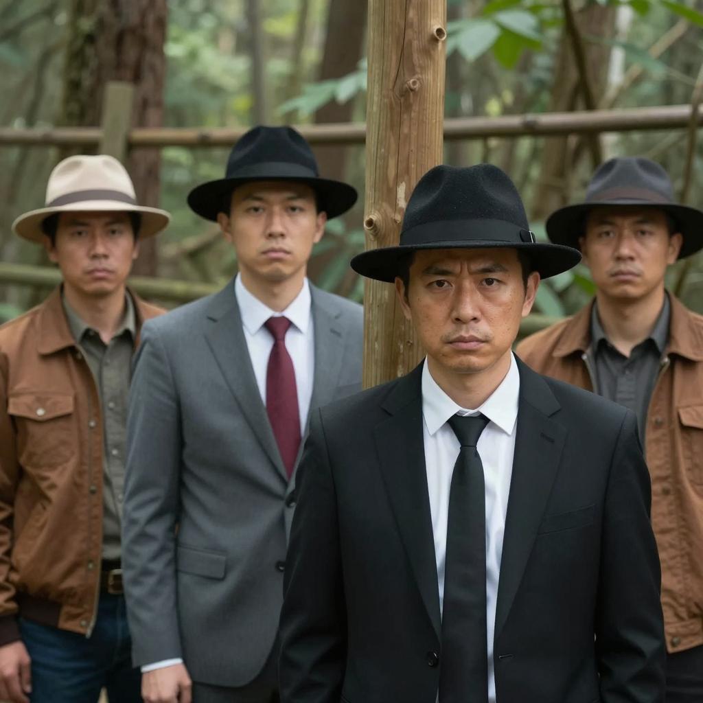 Photograph of four men in dark hats peeking from behind a brick wall. Three men have intense expressions, one looks neutral. Background includes a brick building with a small arched window. Men have dirty faces and worn clothes.
