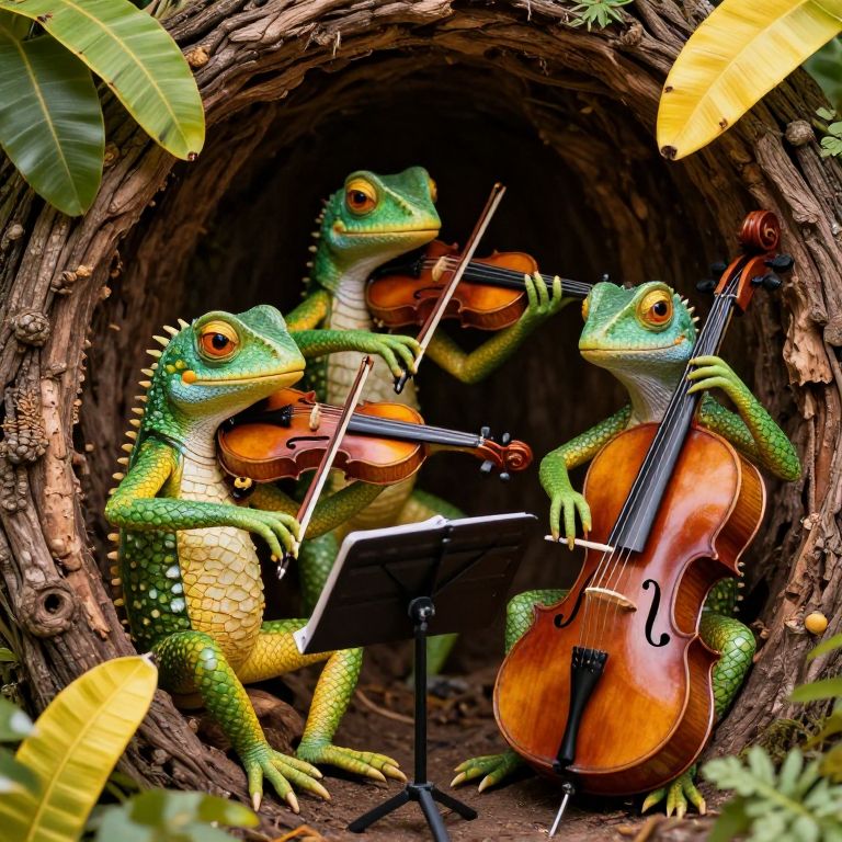 A whimsical quartet of anthropomorphic lizards, adorned with vibrant green and yellow scales, serenely plays classical music inside a hollow tree, their melon-shaped violins and banana-leaf cello blending nature's bounty with enchanting artistry.