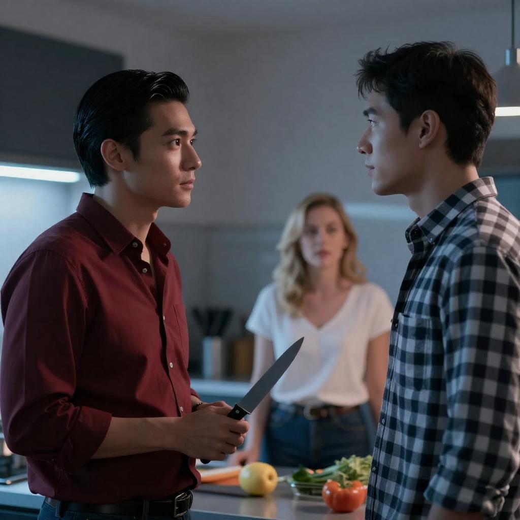 Photograph of a man in a white shirt and glasses, holding a black handgun, aiming it at a woman in a floral dress standing in a brightly lit, red-themed diner. The man is positioned to the right, while the woman is in the background near the entrance. The diner has red walls, wooden floors, and a star-shaped sign.