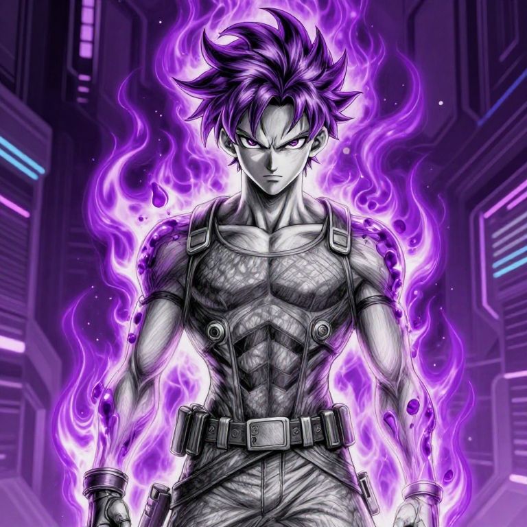 Pencil Sketch king of fighter, iori, purple flame behind character, futuristic, cyber punk background, super realistic, ultra HD, flamboyant background, 4k,