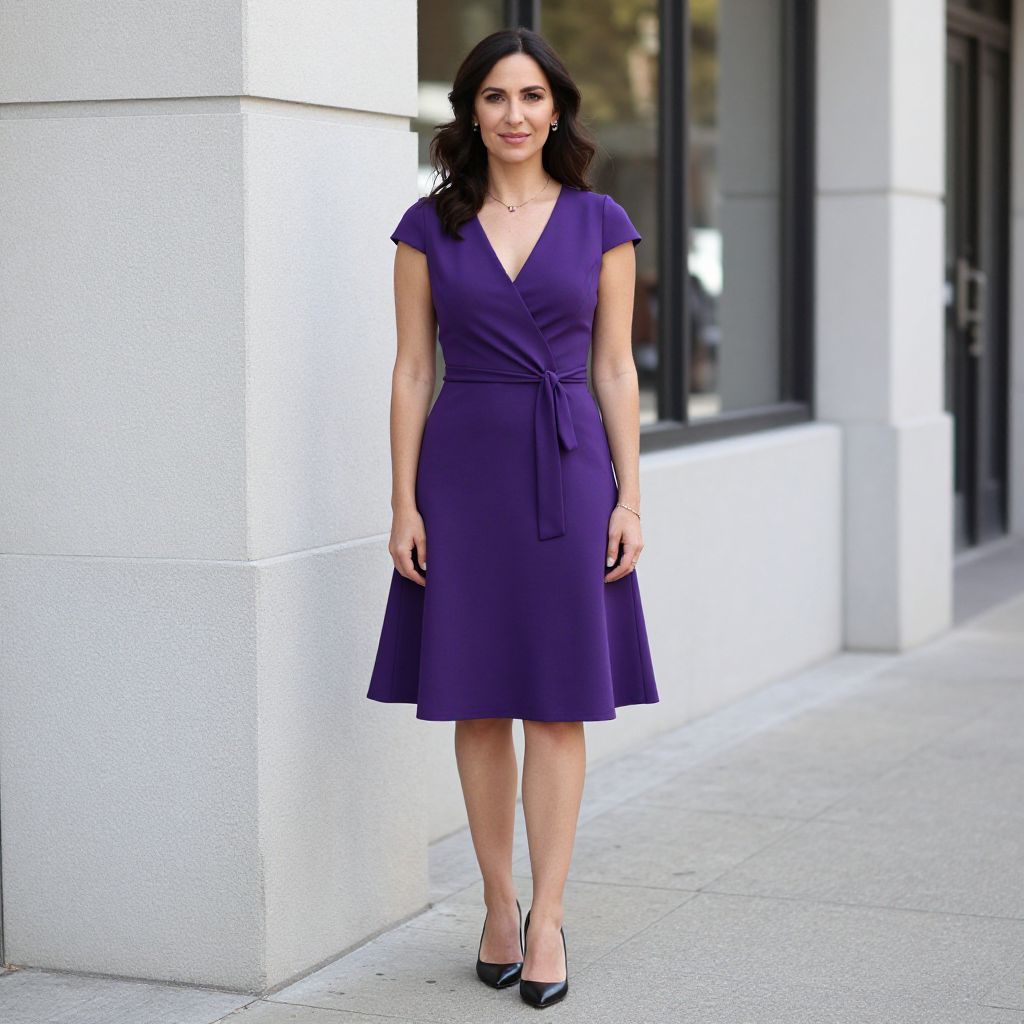 Purple Velma Dress, a woman in a purple dress standing on a sidewalk