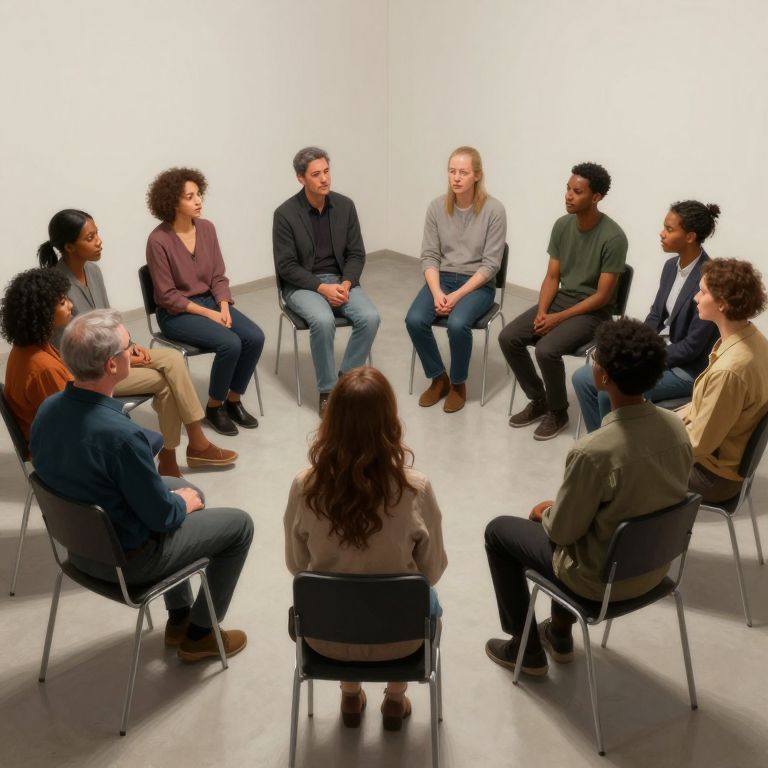 Listen represented by diverse group of people seated in a circle, attentively engaged in deep conversation in minimalist room, soft lighting highlighting expressions of empathy and understanding, realistic detailed digital painting.