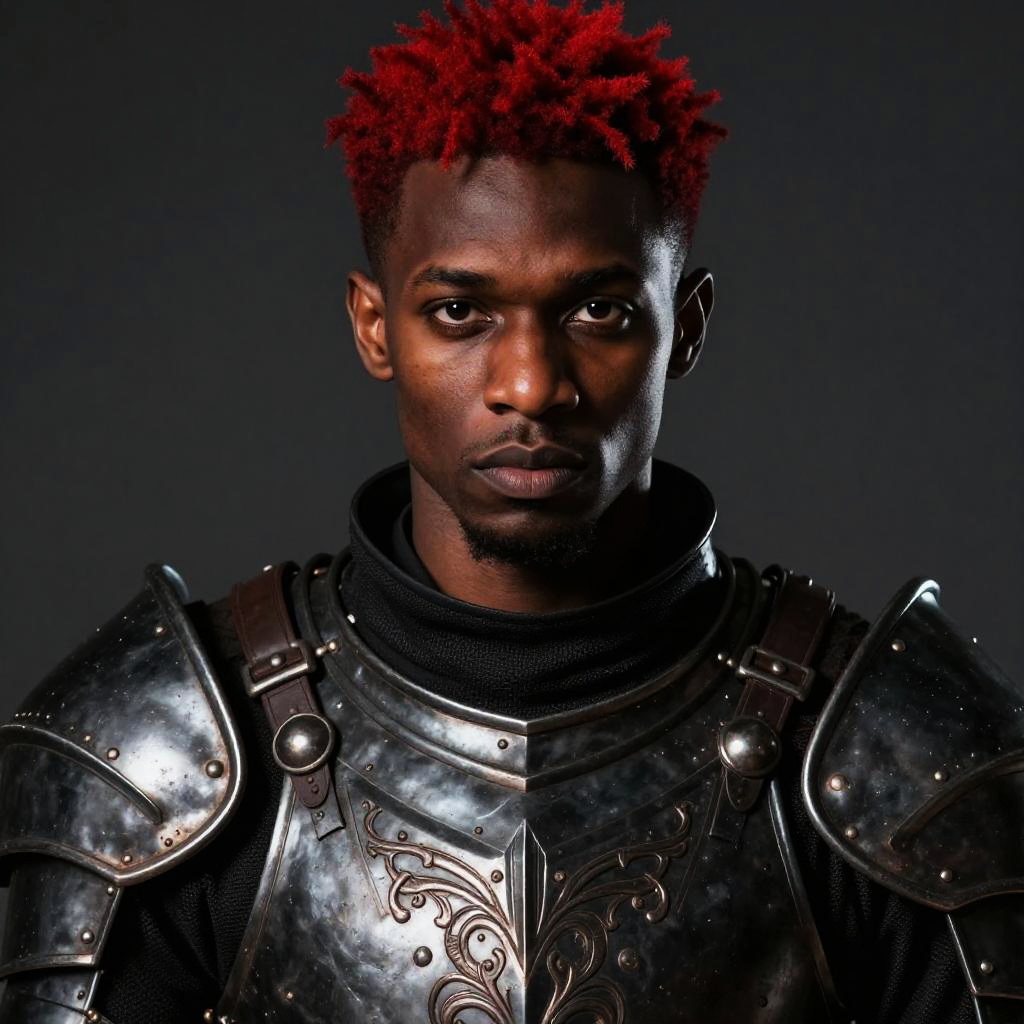Close-up portrait of a young black male wearing detailed black paladin armor with ornate designs. He has vibrant red hair styled upwards, a focused intense gaze, and the lighting highlights the sharp textures of the metal armor. The background is dark, emphasizing the subject and giving a dramatic cinematic effect.