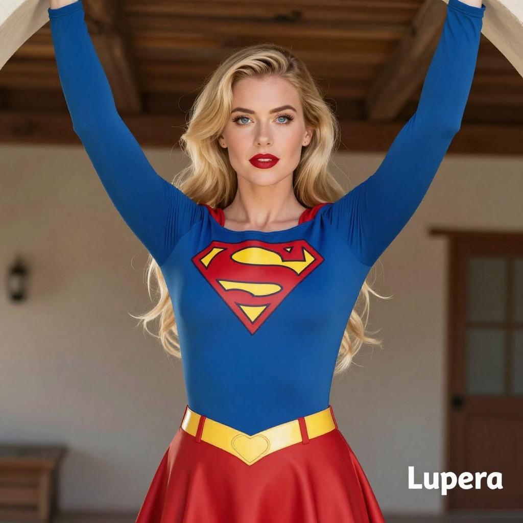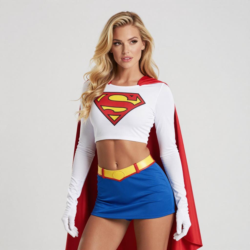 Photograph of a blonde woman with long hair, wearing a white crop top with a red and yellow Superman , blue mini skirt, white gloves, and red cape draped over her shoulders. She stands against a white background, looking slightly to the side with a confident expression.