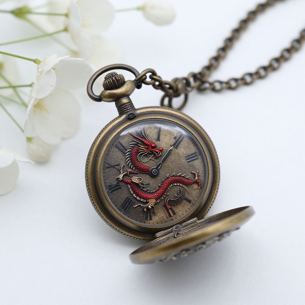 An enigmatic steampunk pocket watch adorned with a crimson dragon, symbolizing power and mystery, invites contemplation of time's eternal dance amidst the delicate whispers of vintage craftsmanship and the soft scent of blooming flowers.