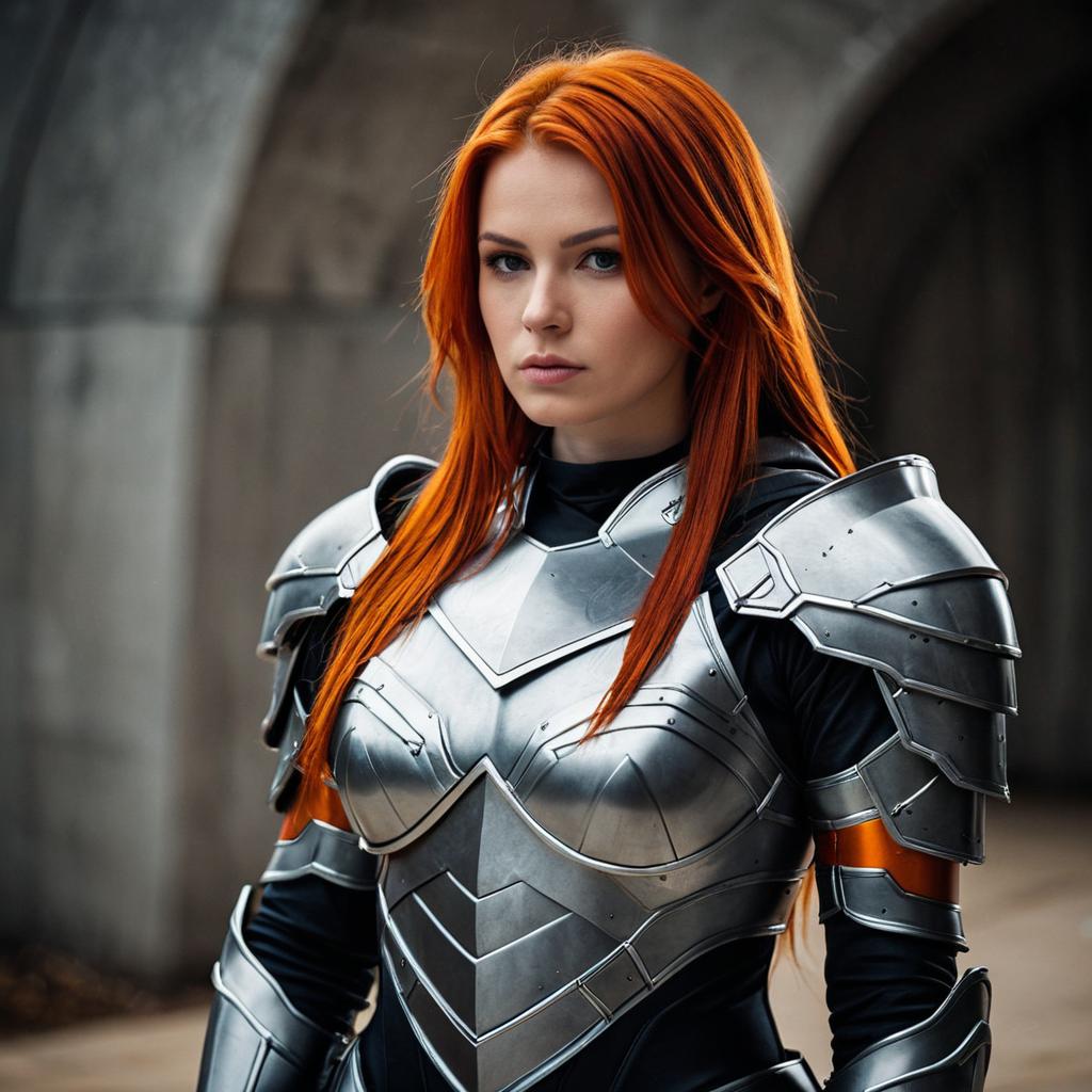 Brave woman costume,1girl, solo, armor, looking at viewer, blurry background, blurry, red hair, orange hair, freckles, closed mouth, arms at sides