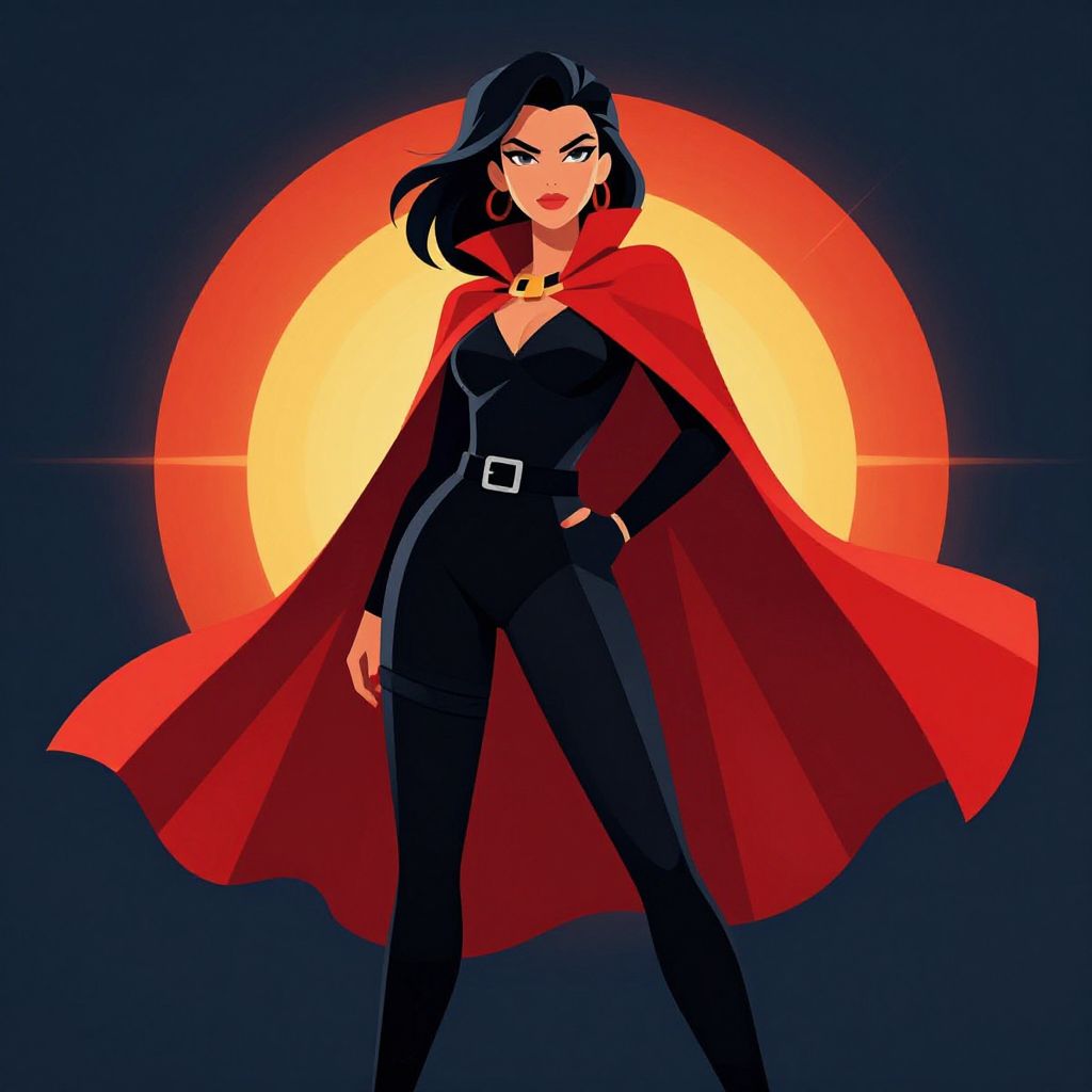 A vibrant vector illustration depicts a confident woman adorned in a sleek black outfit and a bold red cape, featuring dramatic lighting and a retro aesthetic.