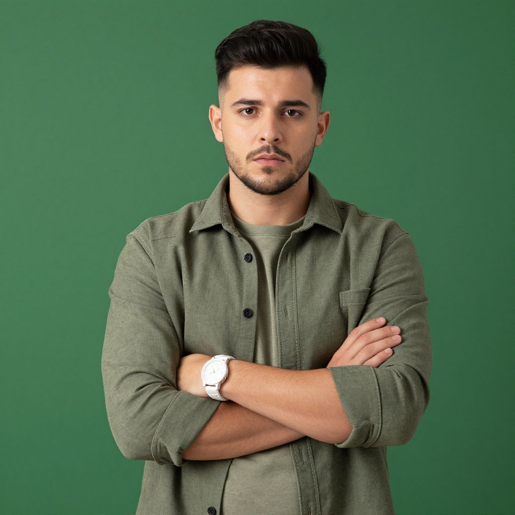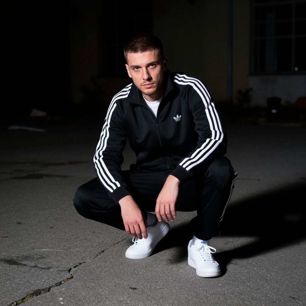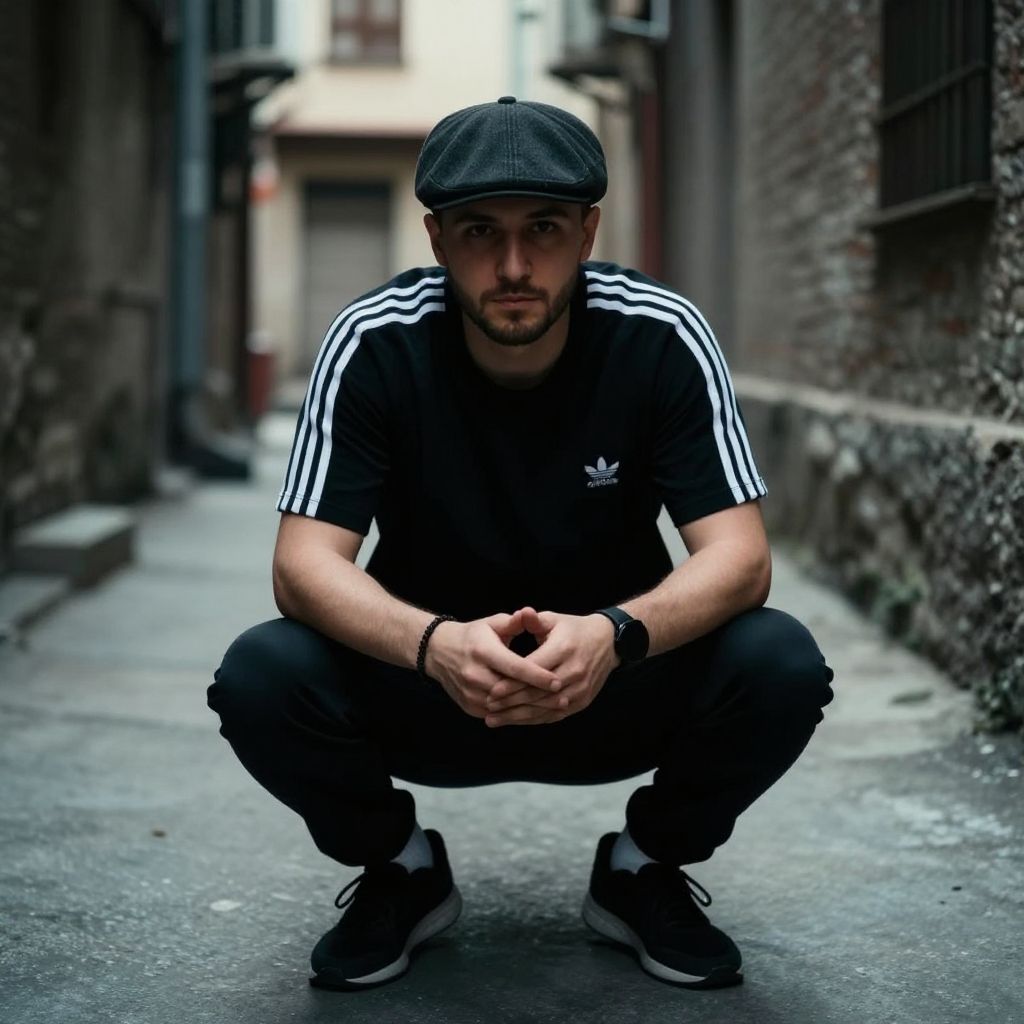 Photograph of a bearded man squatting on a narrow, urban alleyway, wearing a black Adidas shirt, cap, and pants, with a