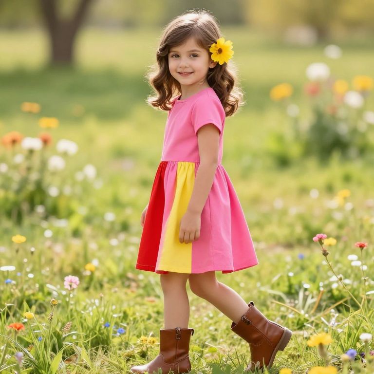 A young girl with soft brown hair, styled in loose waves, wearing a vibrant pink dress with a bold red stripe on one side and a yellow stripe down the center. She has a fresh, bright flower tucked into her hair, adding a touch of natural charm. She is wearing a pair of comfortable brown leather boots, giving her a cheerful and lively look. The scene is set in a sunny meadow with soft grass and blooming flowers in the background, capturing a warm, joyful atmosphere.