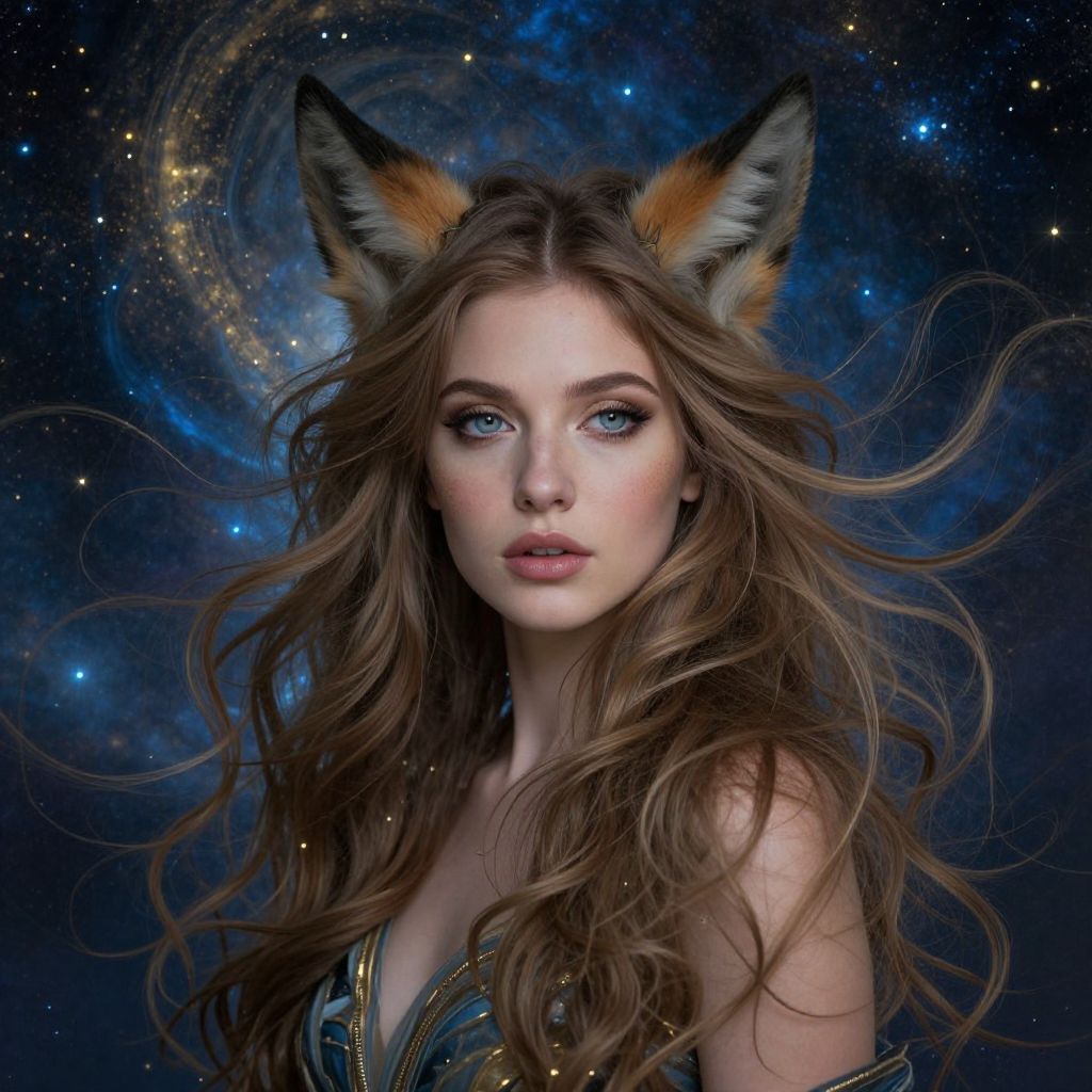 Digital artwork of a beautiful young woman with long, wavy brown hair and striking blue eyes. She has large, fox-like ears with orange and black fur. The background is a cosmic, starry sky with swirling galaxies in shades of blue and gold. She wears a golden, sleeveless top. Her expression is serene yet intense, with slightly parted lips. The image has a hyper-realistic style with a fantasy element, emphasizing her ethereal and otherworldly appearance. The texture of her hair and fur is highly detailed, contrasting with the smooth, starry backdrop.