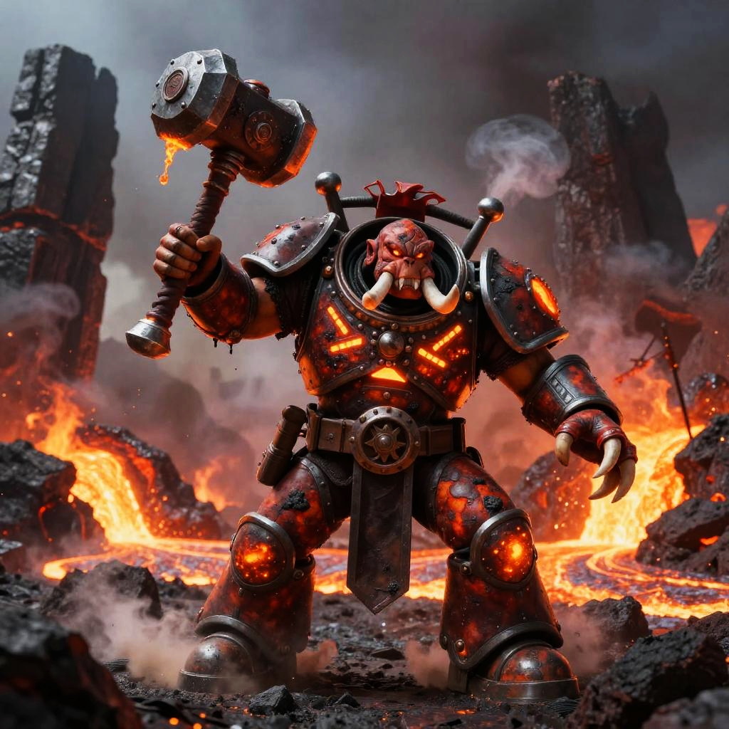Dynamic scene of an Ork Warlord charging into battle, wielding a lava-forged thunder-hammer with molten rivulets dripping from its head, with magma-scarred platework, glowing thermo-runes, slag-caked tusks and steam-welded reinforcements, set in an erupting volcanic forge with rivers of lava, ash-choked skies and collapsing basalt pillars.