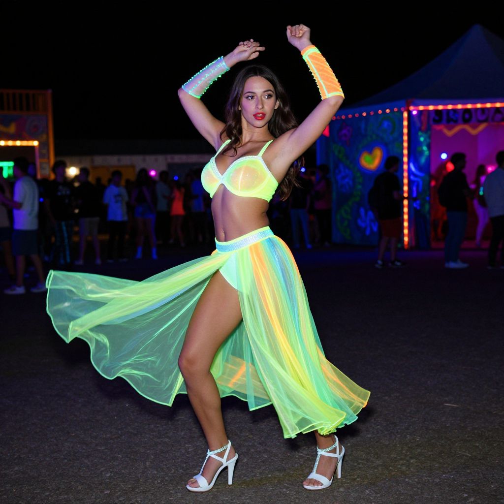 A radiant woman in a stylized glow neon dancer costume, with UV-reactive sleeves, heels, and a flowing skirt that flares into bright neon colors, dancing in a nighttime underground rave carnival, the setting features a darkened arena with walls painted with UV-reactive patterns, she has smooth skin, full lips, and elegant brown eyes, glowing with confidence as her outfit reacts to the UV lights from above and around her.. The woman has big tits and cute face