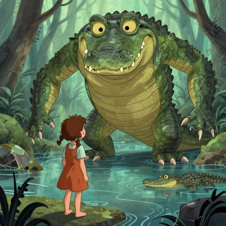 Digital illustration of a young girl in a red dress facing a giant, smiling crocodile with glowing eyes in a lush, misty jungle by a tranquil