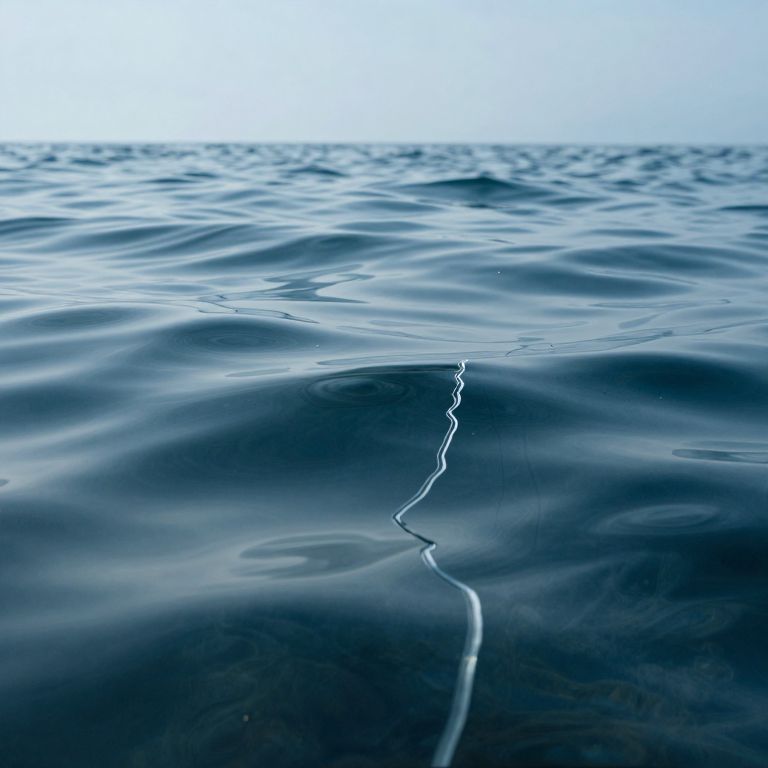 Photograph of a calm, deep blue ocean surface with gentle ripples. A thin, white line runs vertically through the center, slightly distorted by the water's movement. The horizon is faint and blurred in the background, blending into a pale, almost white sky. The image emphasizes the texture of the water, with light and shadow creating a sense of depth and tranquility. The overall tone is cool and serene, with minimal color contrast.